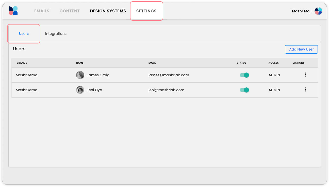 The Users page is located in the main navigation under ‘Settings'. Once in Settings, you can access the Users page as part of the sub-menu. Here you can add new users, edit existing users, or remove any users who no longer require access to MashrMail.