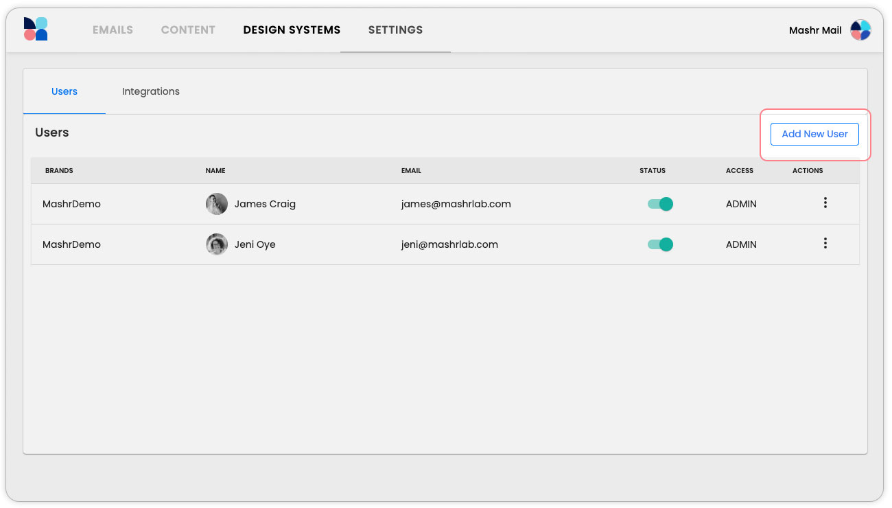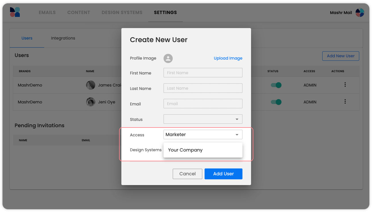 When creating users, with roles other than Admin, you will be able to assign Design Systems. This is a great way of granting access to MashrMail to your wider organisation while still ensuring that only specific users have access to particular parts of your business. Users will only see the Design System and all emails created using that Design System when they log in so this is a great way of separating out sub-brands or departments within your organisation.