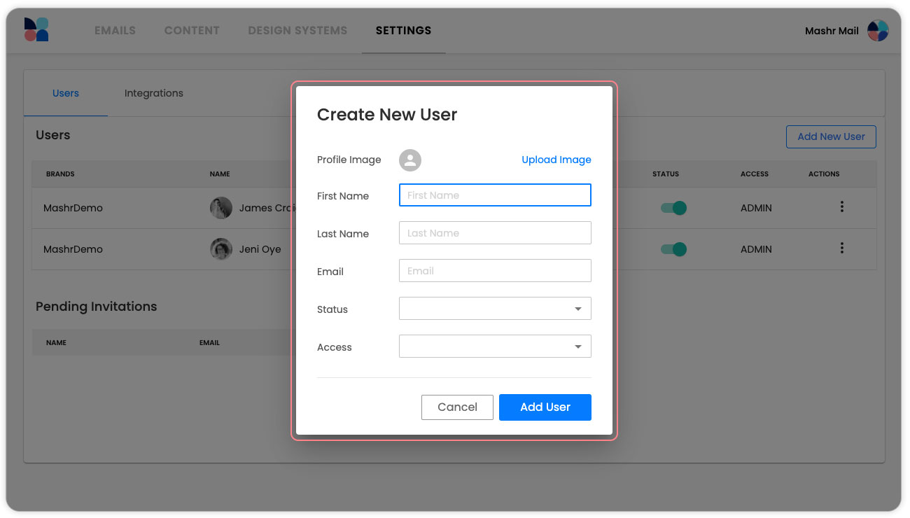 You will then be prompted to enter the relevant information for your new user. After entering these details the user will be emailed an invitation link to MashrMail where they can set their password for their account.