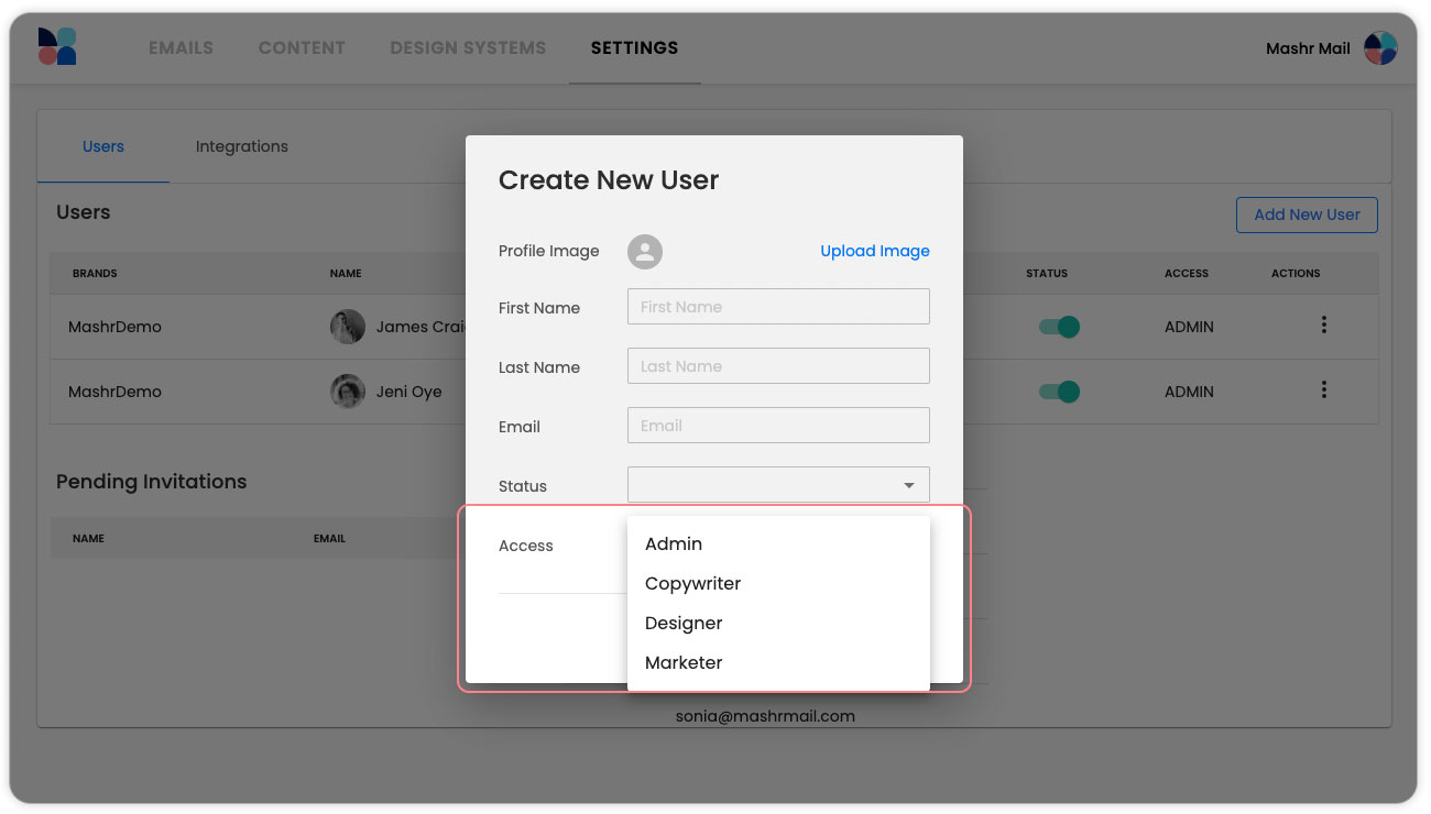 Admin: These users are responsible for the setup and maintenance of the centralised email production system using MashrMail. They have full access to all settings in the platform.