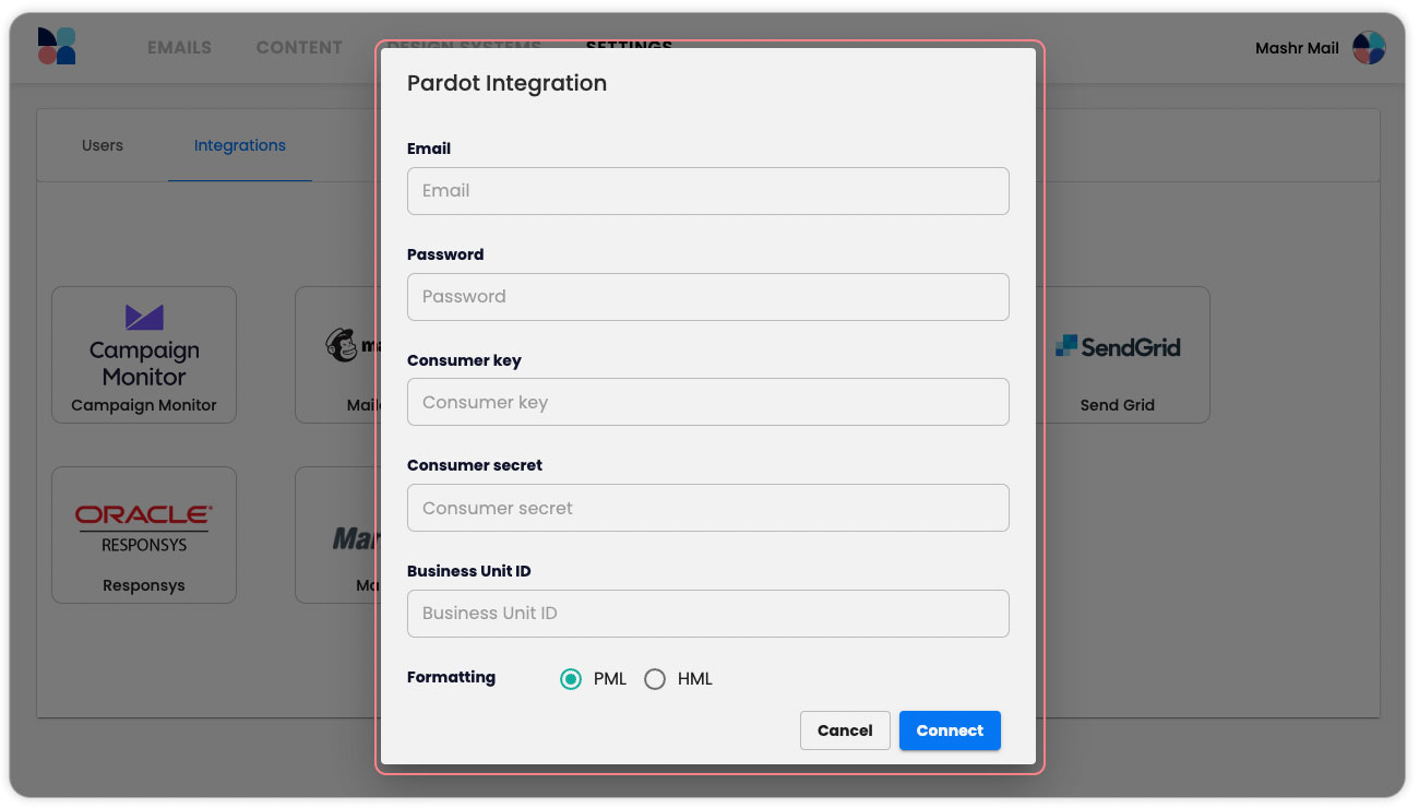 MashrMail delivers the most value when it integrates seamlessly with your email sending platform. By setting up a Pardot integration you will be able to easily export your finalised emails directly to Pardot with a click of a button.